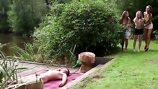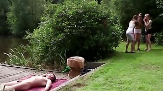 3 neugierige sexy britische babes spielen mit dem schwanz des kerls in einer heißen outdoor-cfnm-szene