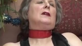 Raven head voracious grandma of my comrade drills her dumpy stinky slit with tremendous fuck toy