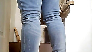 Sweet milky caboose of a stranger girl in blue jeans filmed in the toilet
