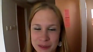 Slim and pallid blond haired chick provides older man with adorable blowjob